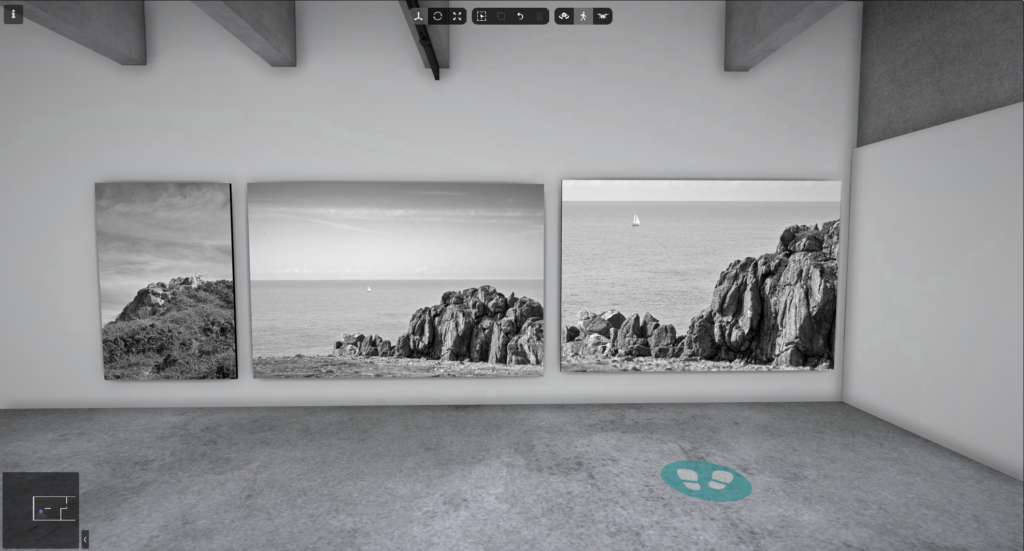 Download an empty gallery file…then insert your images and palce them on the walls. Adjust the perspective, size and shape using CTRL T (free transform) You can also add things like a drop shadow to make the image look more realistic…