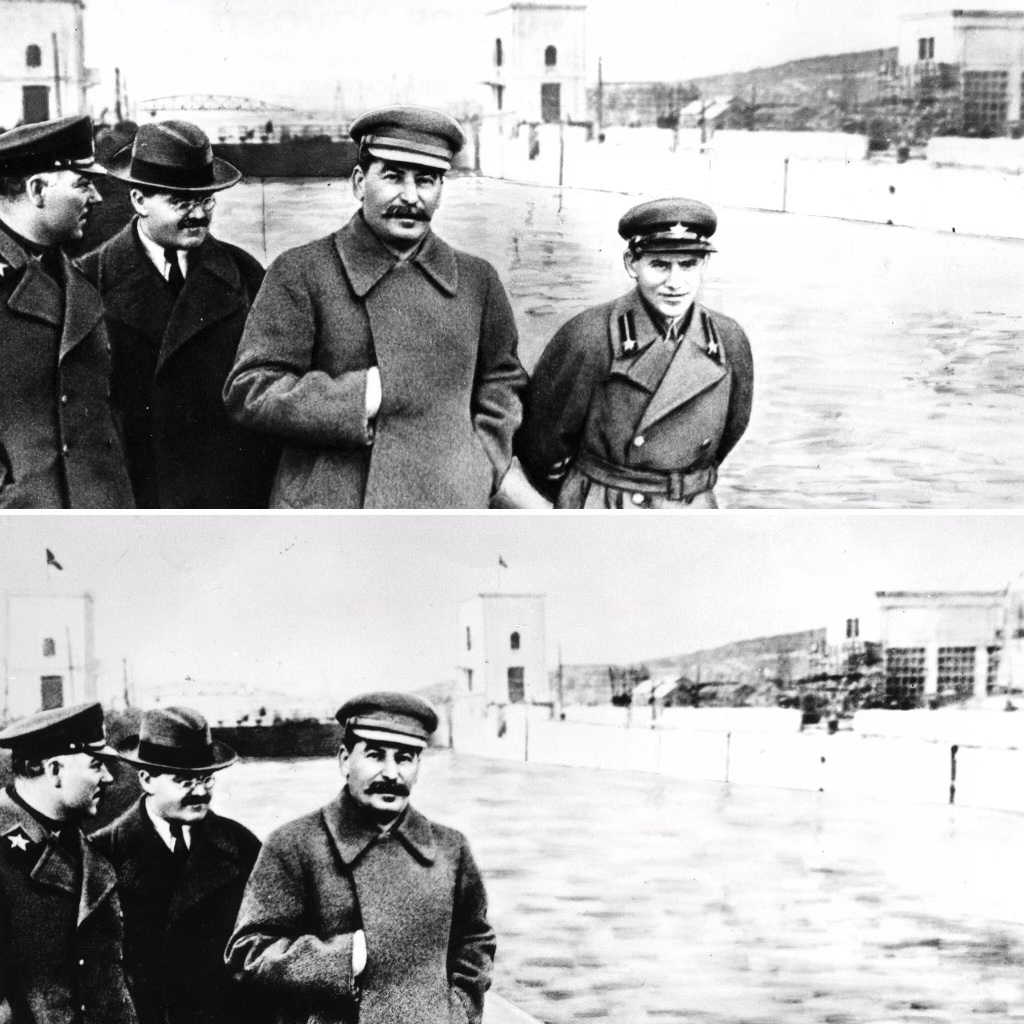 Then, he disappeared from Soviet photographs, too, his existence blotted out by a retouched suit on another official from the original photo.