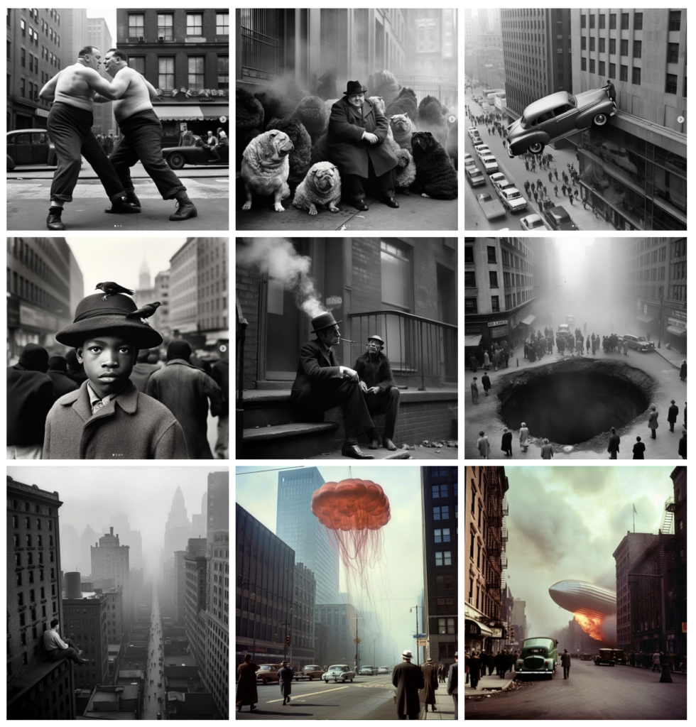 AI EXPERIMENTING > Using your images produce a variety of AI generated images (at least 10 variants) using Photoshop AI, DreamStudio or Midjourney. Generate AI images inspired by street photography and Cartier-Bresson’s theory around the decisive moment. Either ‘train’ AI on your original images or recreate street photographs using relevant text prompts. For example,use key terminology, such as specific words and phrases linked to subject matter, capturing moment, locations & places, points of view, approaches, composition and formal analysis, camera handling and techniques.