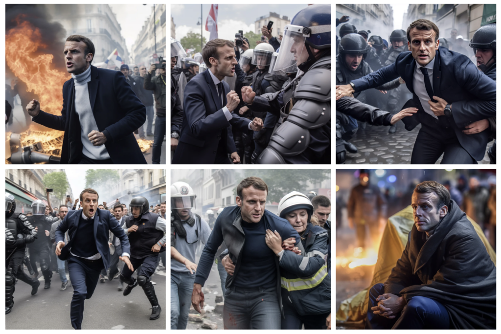 David Fathi: False image generated by photographer David Fathi via Midjourney showing Emmanuel Macron in contact with police officers. Credit: David Fathi / Midjourney