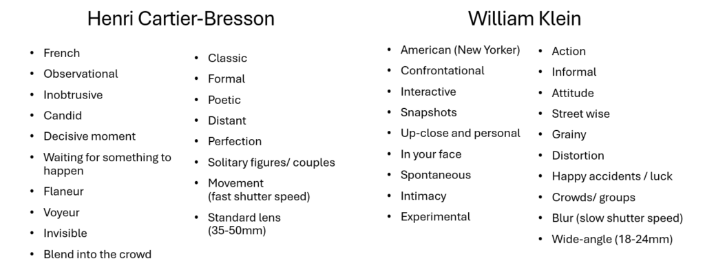 Compare & Contrast > Henri Cartier-Bresson and William Klein and their different approach to street photography which can be described as observational vs confrontational